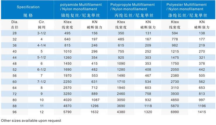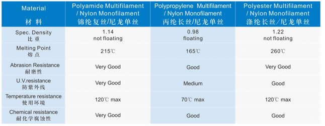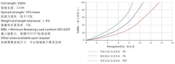 ![]() 概述 >> General Description 品種有錦綸復絲/尼龍單絲、丙綸長絲/尼龍單絲、滌綸/尼龍單絲等系列產品。該產品是是經過特定的加工工藝制作,具有超常抗耐磨性能,比普通化纖繩纜提高1倍以上,加上耐海水,耐化學腐蝕,耐紫外線輻射,耐高溫等優點,已得到船舶系泊,拖拽的廣泛應用。主要用于遠洋運輸、重工造船、國防軍工、石油勘探、港口作業等領域。 It has serial products including polyamide multifilament/nylon single yarn, polypropylene filament/nylon single yarn, polyester/nylon single yarn etc. As a new high-tech product processed by special technology, it has superior wearing resistance, which is double than that of normal chemical-fiber ropes and cables therefore it has been widely used in mooring and towing of ships and vessels. The products are mainly used in fields of ocean transportation, heavy industry, shipbuilding, petroleum survey and harbor operation etc. 主要性能 >> Main performance